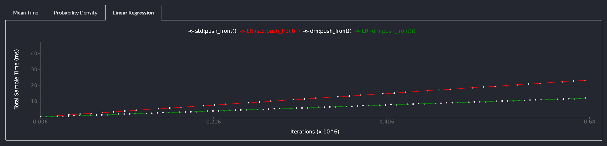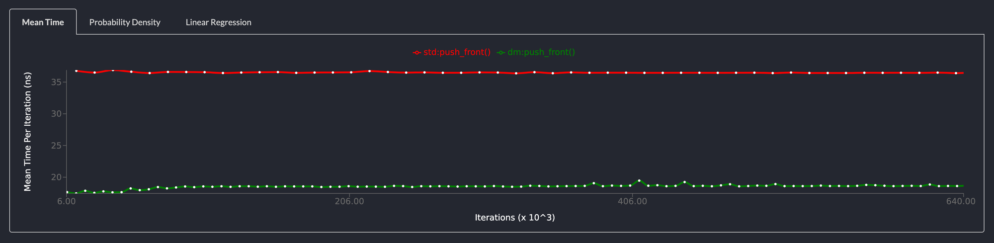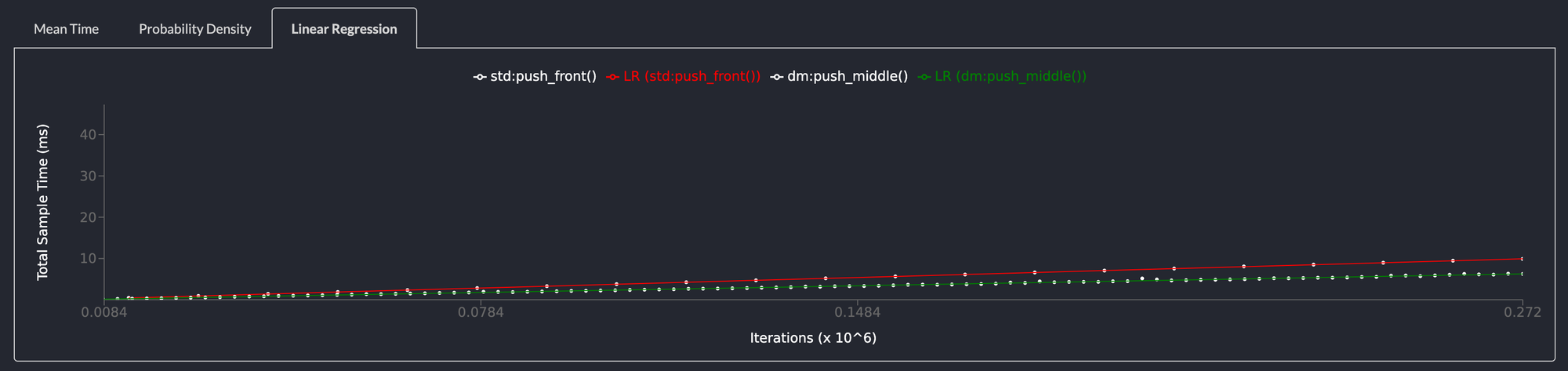 The standard library LinkedList doesn't allow pushing to the middle of the list in constant time so this benchmark compared pushing to the middle of the deepmesa list vs pushing to the front of the std::collections::LinkedList.