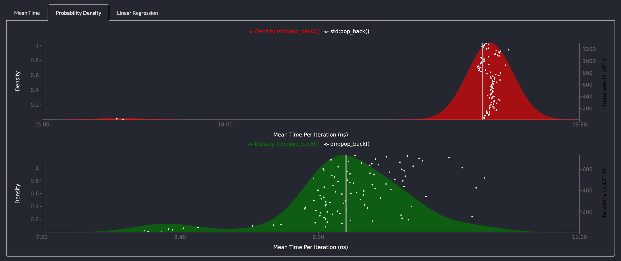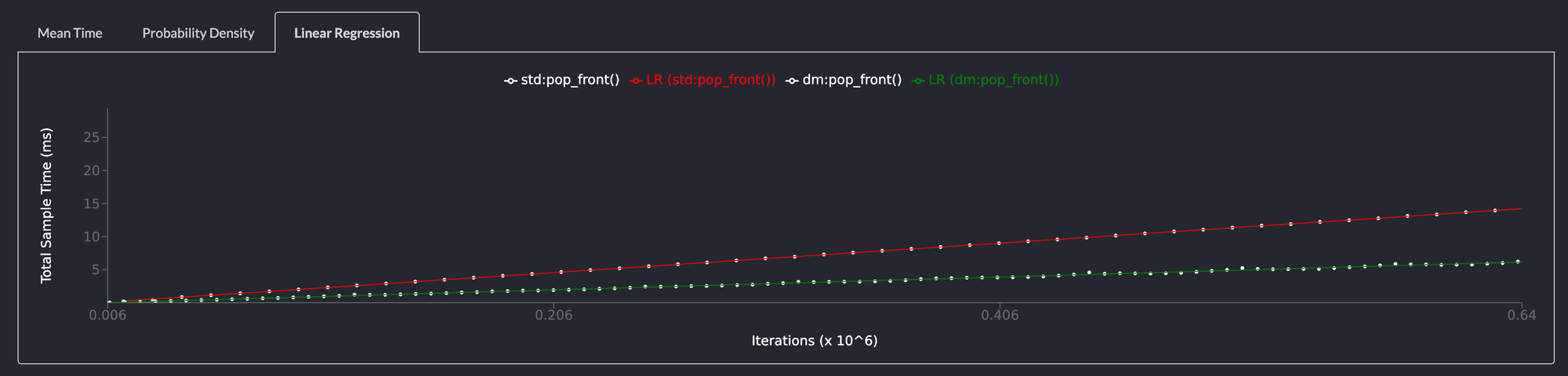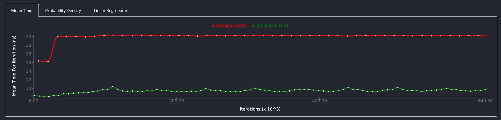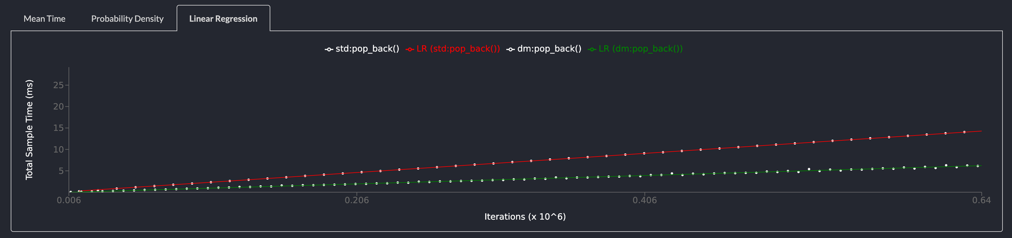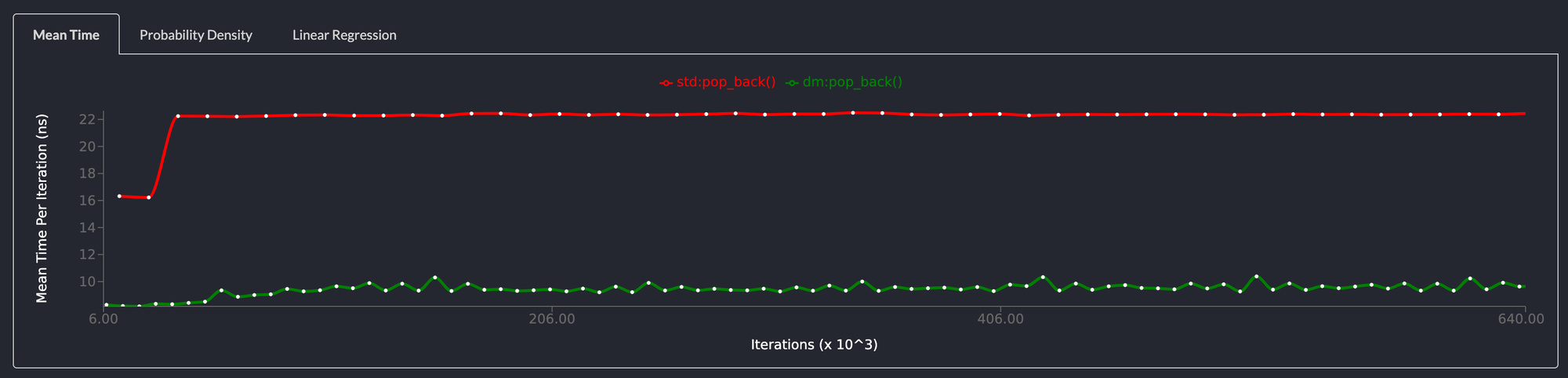 Removing elements from the back of the list also shows the same performance characteristics as pop_front() and for the same reasons.