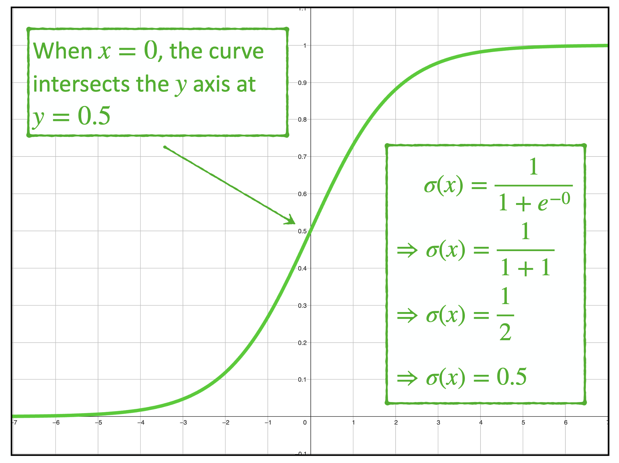 \[\sigma(z) = \frac{1}{1 + e^{-z}}\]This function maps z, to values between 0 and 1 and has the characteristic "S" curve that intersects the Y axis at 0.5
